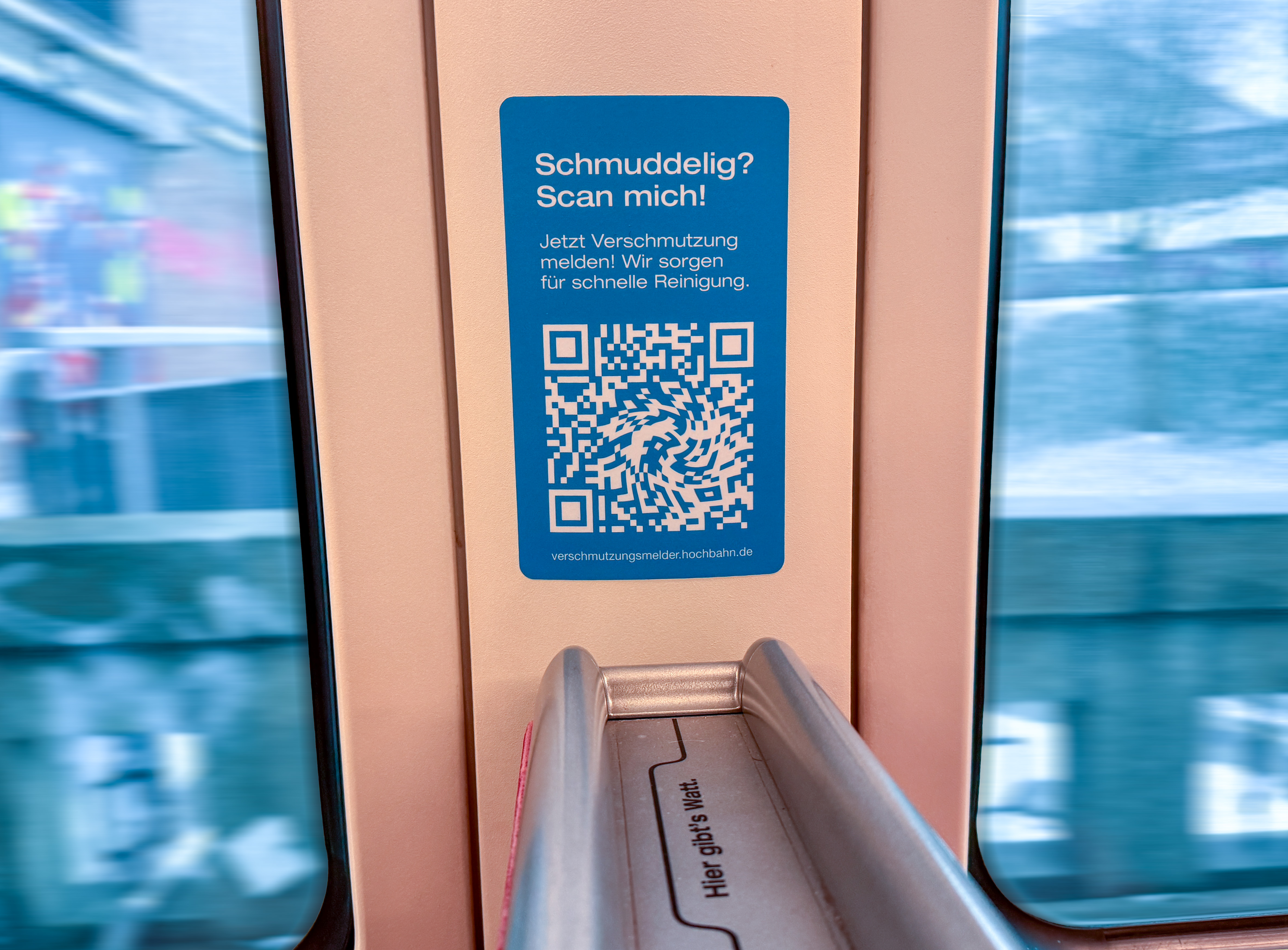 Die Hamburger Hochbahn AG (HOCHBAHN) startet ab dieser Woche ein Pilotprojekt zur Meldung von Verschmutzungen in U-Bahn-Wagen. Im sechsmonatigen Test können Fahrgäste der U3 Verschmutzungen einfach per QR-Code melden.