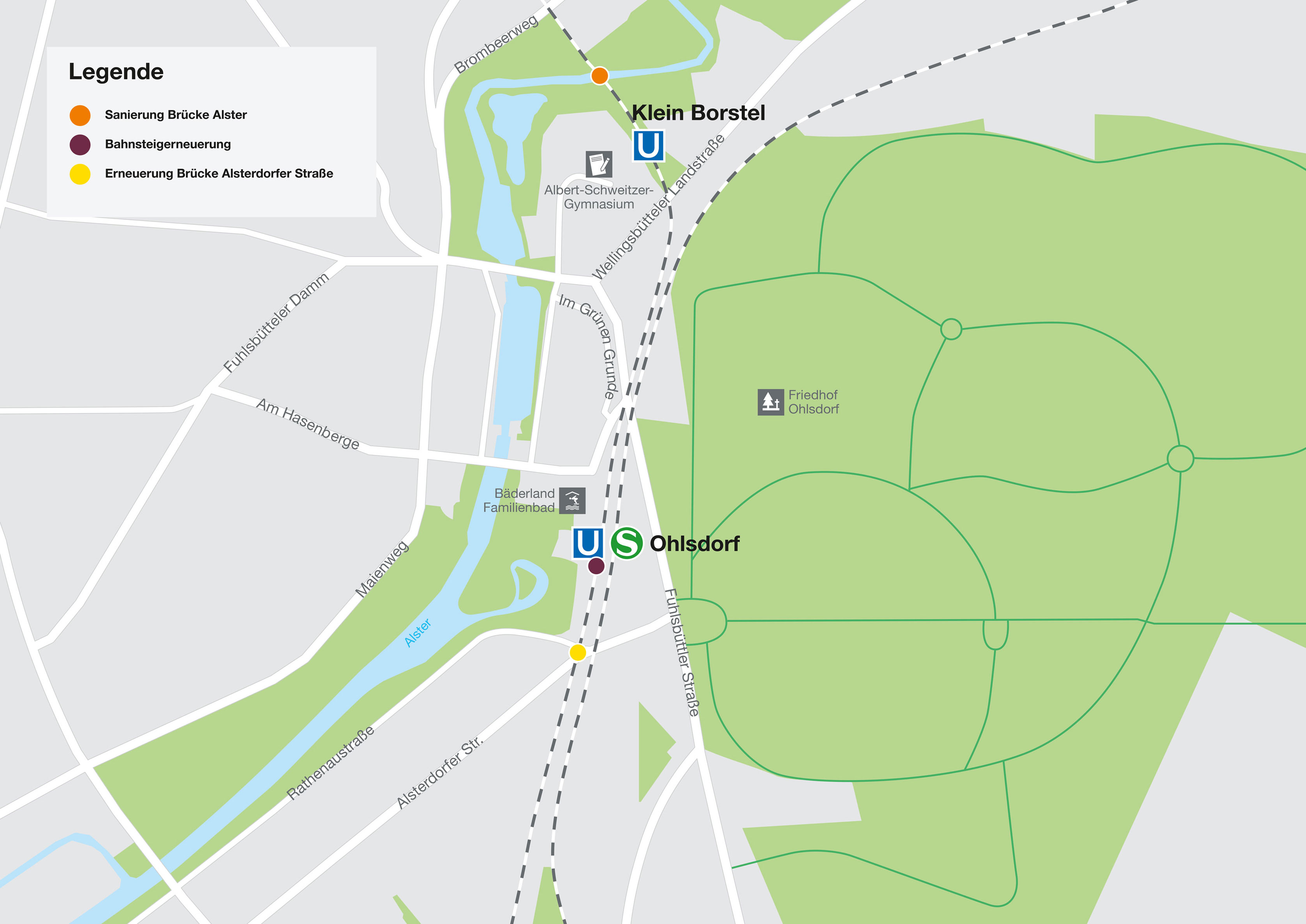 Um die Auswirkungen für Fahrgäste möglichst gering zu halten, nutzt auch das U5-Projektteam die Sperrung der U1 aus, um an der Haltestelle Sengelmannstraße Baumaßnahmen zu erledigen, die nicht unter laufendem Betrieb erfolgen können. Alle Infos hierzu finden Sie auf U5 Sengelmannstraße | schneller-durch-hamburg.de